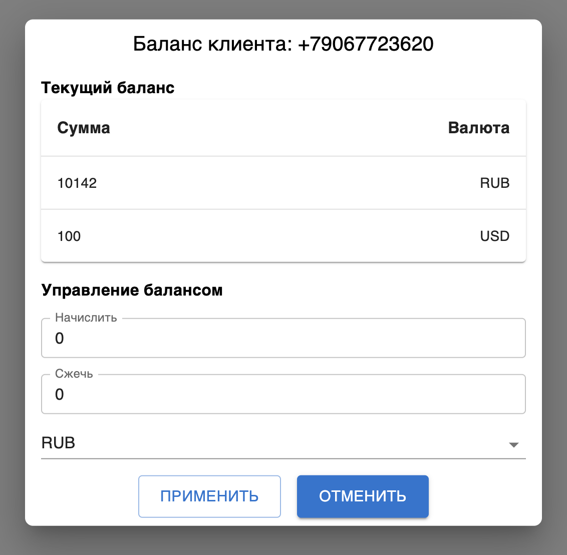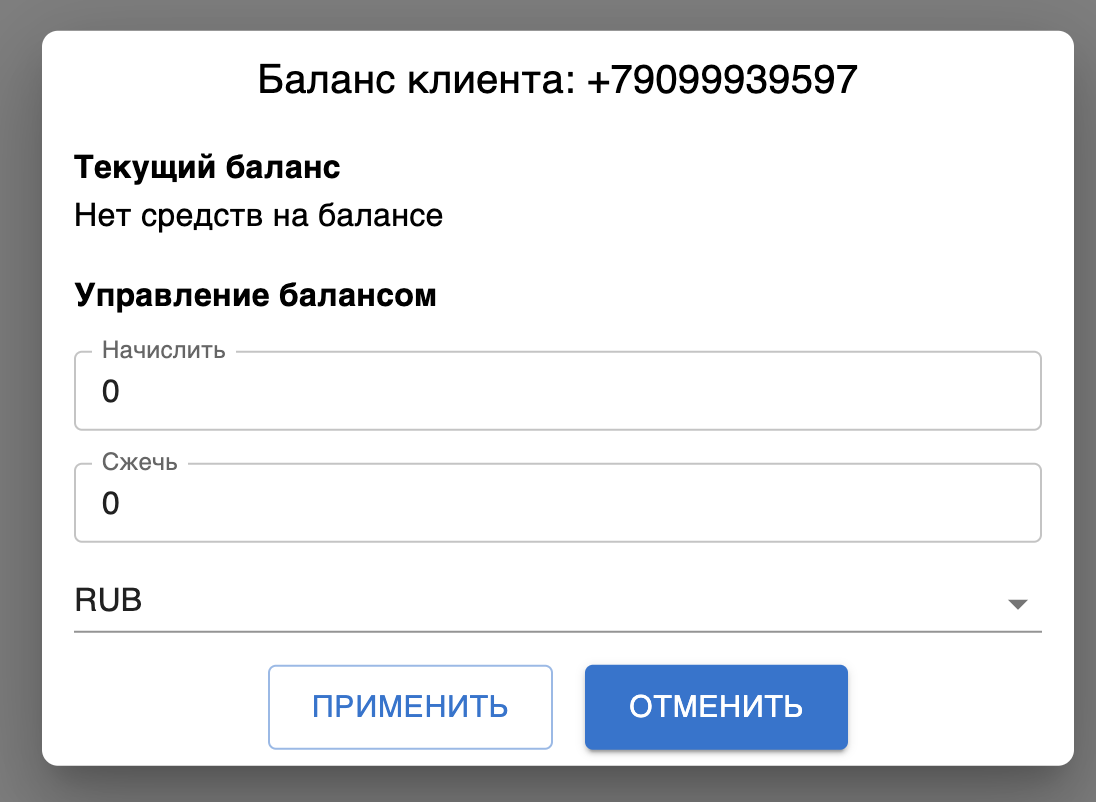 В данном окне первая строка ввода Начислить (Mint) предназначена для пополнения, вторая строка ввода Сжечь (Burn) предназначена для списания средств. Селектор внизу предназначен для выбора валюты (RUB, USD, BONUS_RUB). Для работы с бонусами выбирайте BONUS_RUB.