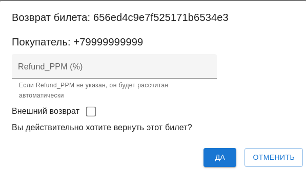 - Вы можете ввести Refund_PPM (%) для указания процента возврата. Если Refund_PPM не указан, он будет рассчитан автоматически